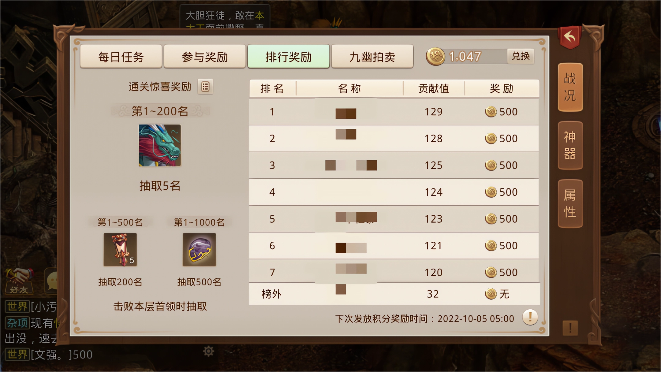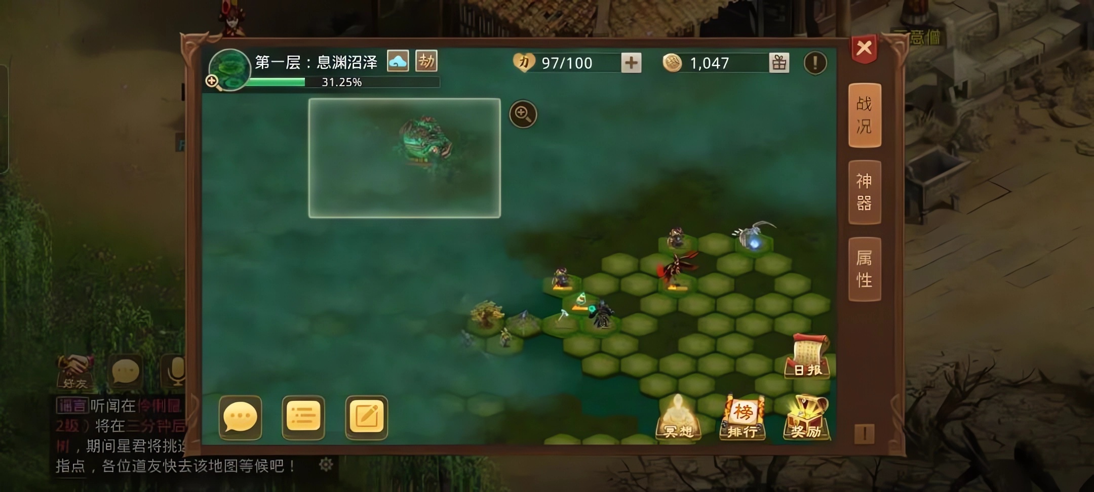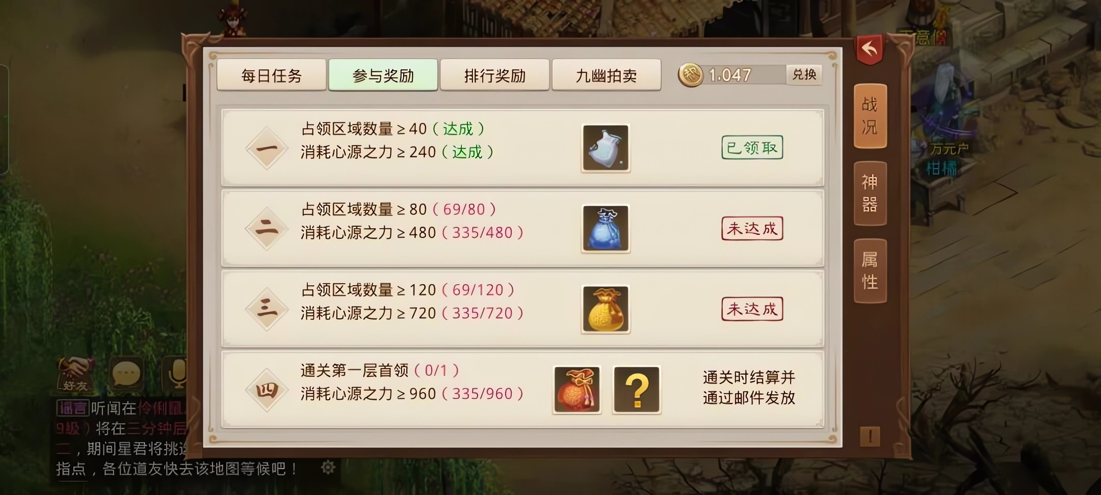 2、参与奖励,可以获得道具奖励。 这个就有一定的门槛了,要全服玩家占领每一层一定数量的区域,才可以获得奖励,因为九幽属于集体推本,人多力量大,前期数量基本可以达到,但是想要打倒最后的boss,还需要大家一起研究出一个最佳的路线,不要浪费过多的心源。