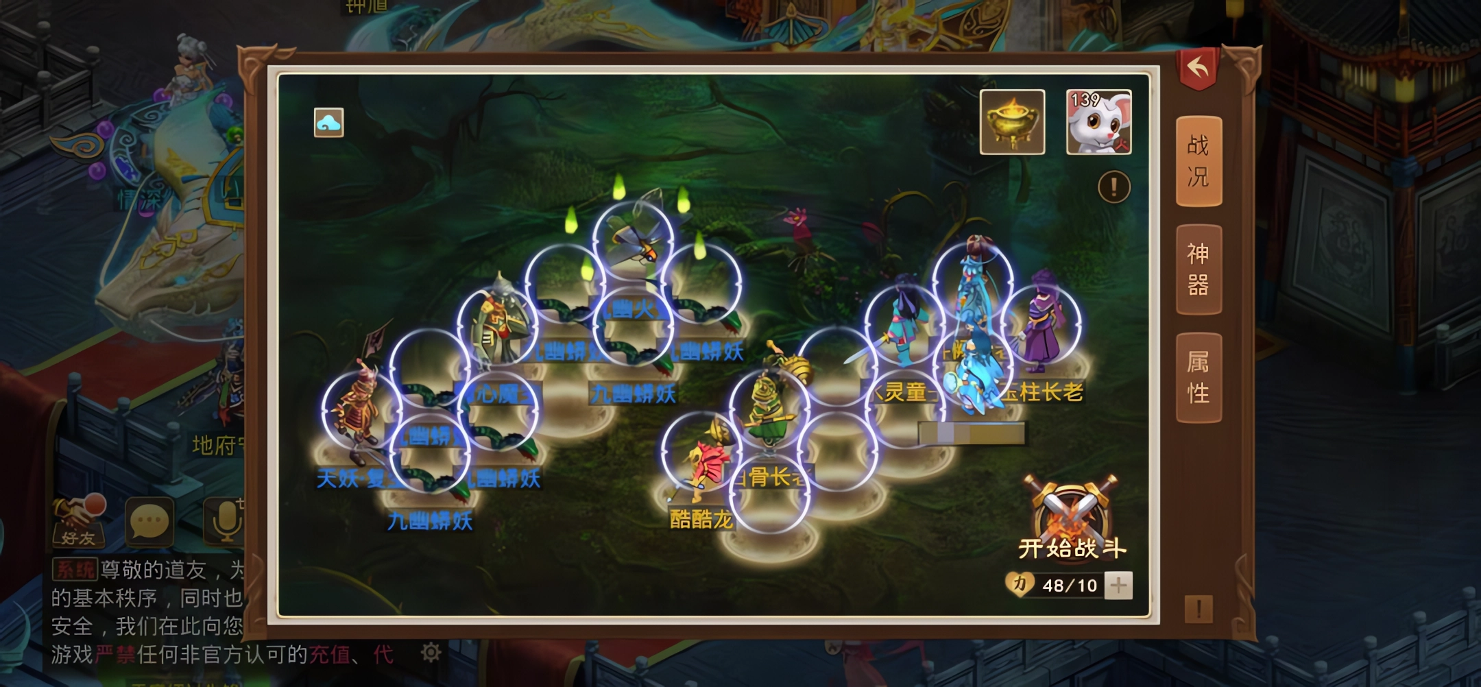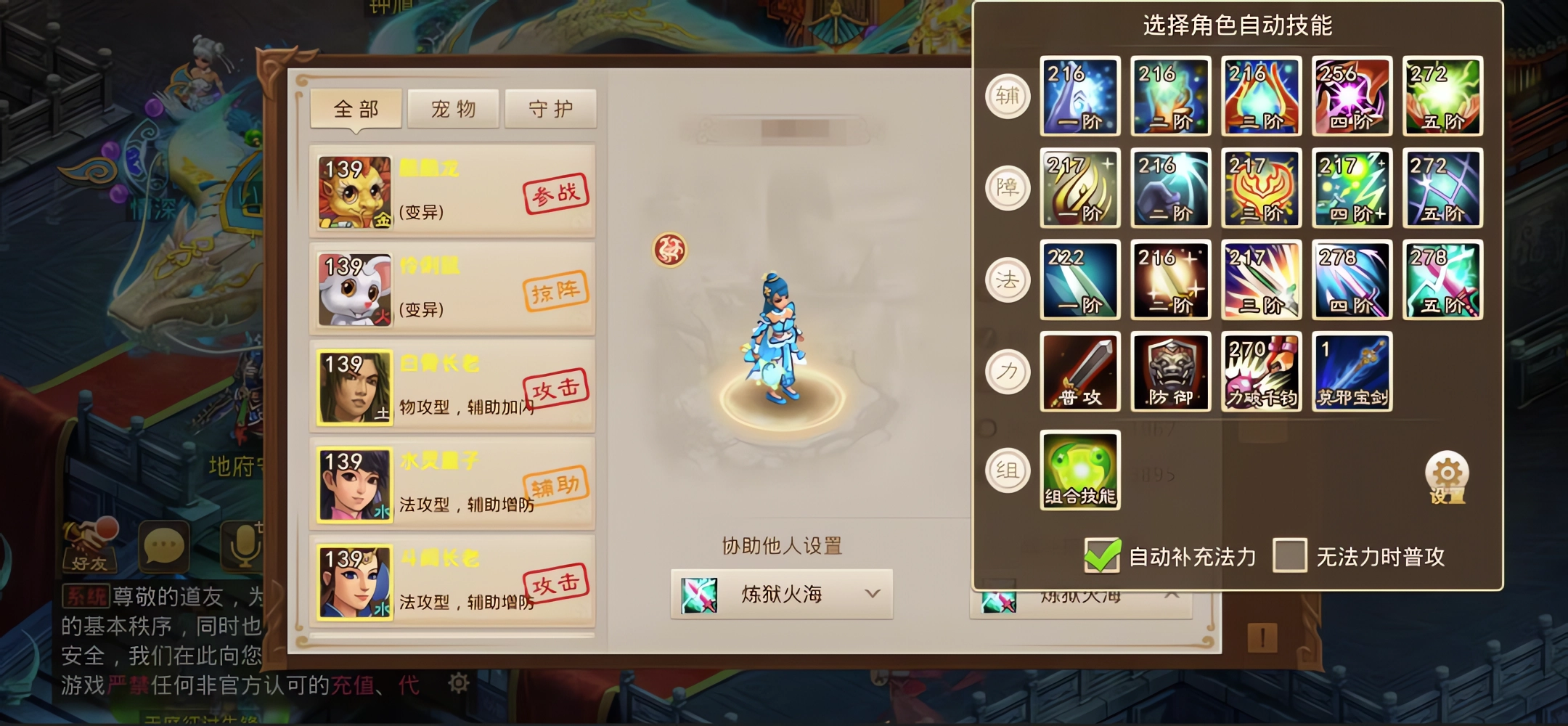 6、属性系统:可以调配战斗事件参战目标,上场的人物技能、参战宠物以及技能,参战守护以及技能。这里人物和宠物的技能设置是可以用组合技能的,大家注意一下。