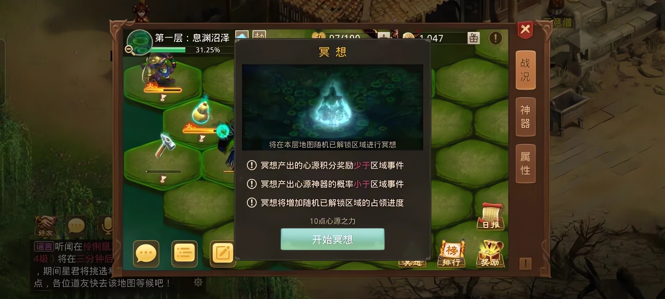 7、冥想系统:冥想可以一键操作,瞬间完成,每次消耗10点心源之力,但是要切记,冥想获得的心源积分以及获得心源神器的几率都比正常推区域事件图要少,也不会产生区域事件的排名,而每层的整体排名,是根据无数个单独区域事件排名所获得的贡献相加去计算的,所以在有时间的情况下还是首选正常推图。
