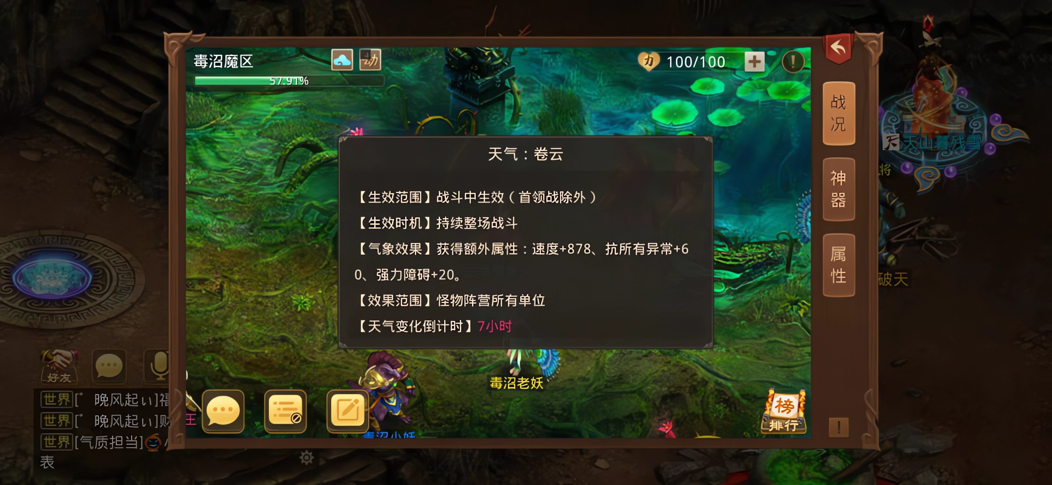 4、天气系统:进入九幽,不同的时段,可能会面对不同的天气状态,不同的天气都会对我们的战斗造成不同的影响。目前已知道九幽第一层的天气有五种,分别是:冰针、龙卷、强雨、雷爆、卷云。(因为出现的天气都会有介绍以及对抗策略,大家面对不同的天气仔细观看,及时调整即可)