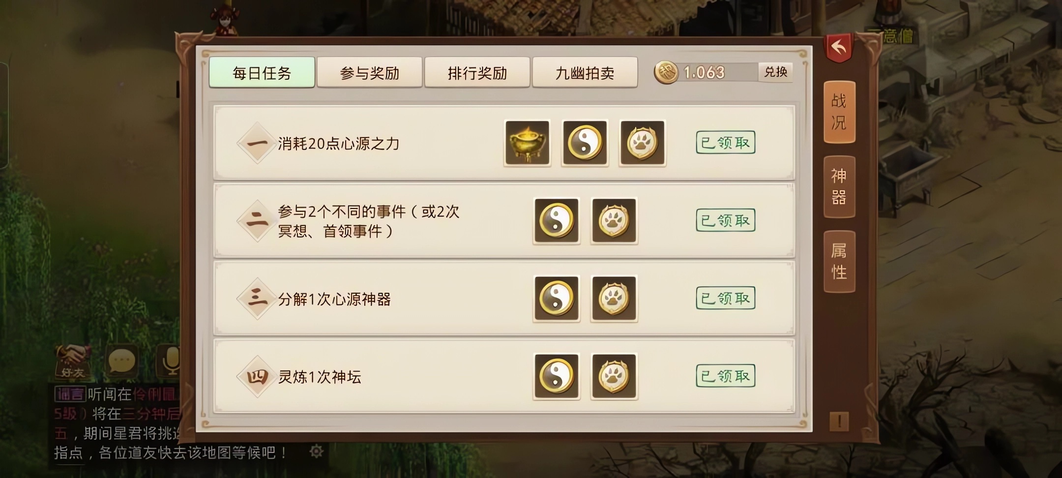 2、心源神器:在九幽中的专属装备系统,分为两种,一种是战斗事件当中用的神器,可以提升我们的属性,另外一种是非战斗中用的神器,可以提升或者降低随机事件的触发几率等属性。同类型的神器可以进行升星,提升属性/效果,没用多余的神器可以进行分解,极品神器可以通过九幽之尘相互转化。