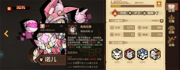 对抗爆发自保能力最强的护卫,诺儿大招有着4秒无敌来无伤接下BOSS的技能爆发。自动技能的破甲效果也适合对抗强力单体BOSS。需要多堆充能速度,手动释放大招来抵挡关键伤害。