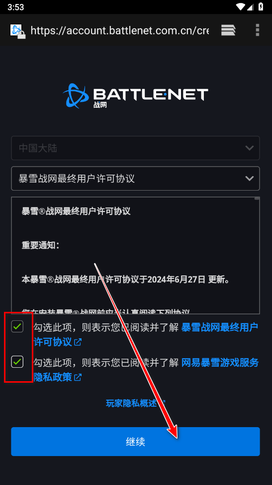 3、勾选同意相关许可和隐私政策,并点击继续