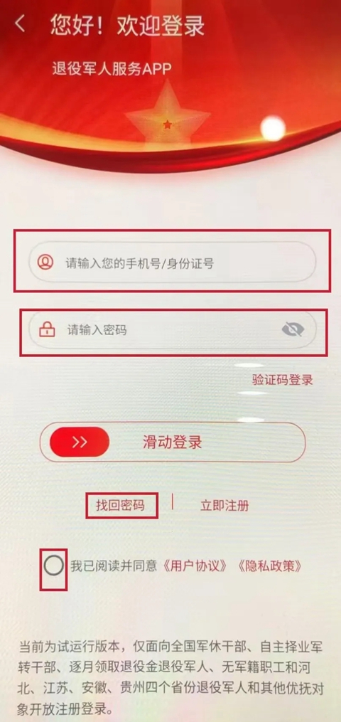 提醒:如果您之前用互联网端进行过年度登记,可输入手机号/身份证号、密码,勾选“用户协议和隐私政策”,滑动登录模块后即可登录。