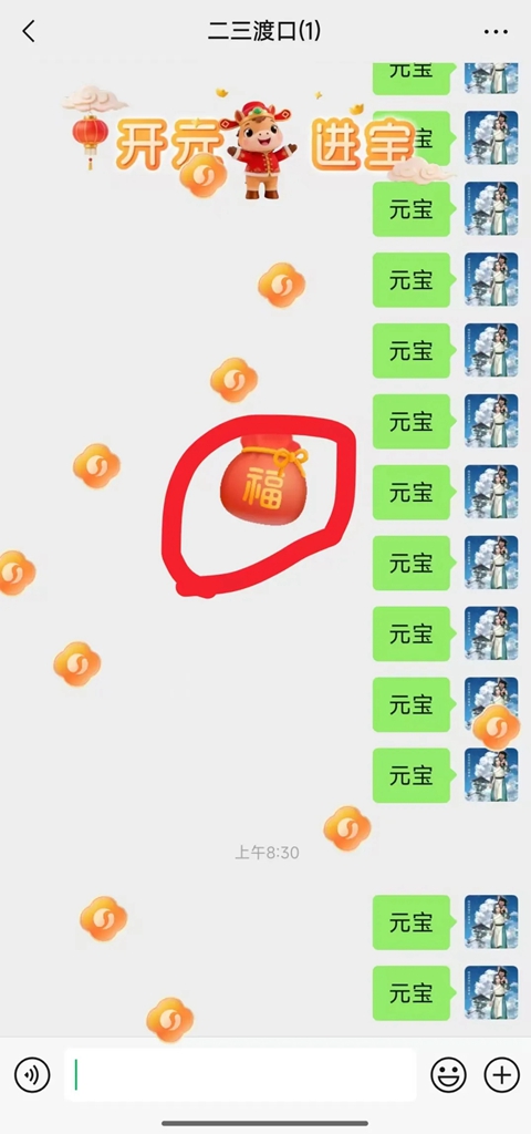 需要注意,微信要更新到最新版本(安卓:8.0.68),版本低的话,输入“元宝”,不会触发福袋。可以在跟好友的对话框一对一发送“元宝”,可以在群聊发送,也可以在微信文件传输助手中发送。多发几次,会收到红包福袋的。