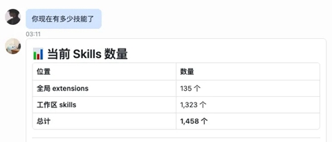 太空噜负责写材料,对接写作skills,用于内容创作。大总管水水目前有1k多个skills,他会筛选出来适合其他小伙伴的skills,进行分享,监督其他的小伙伴学习除了对话框单独对话,飞书还支持多机器人进群,按照这样方式拉群。