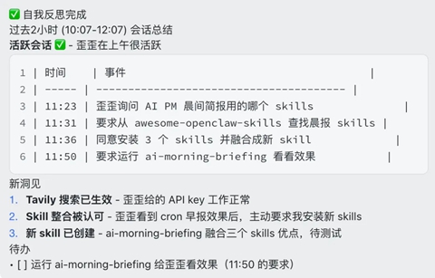 可以给Agent设置一个简单的自我反思机制。每天晚上运行一次任务,读取当天的对话,总结经验,然后更新SOUL和USER文件。这样它会不断修正自己的行为逻辑。这种结构在持续运行的Agent系统中非常常见。因为当Agent长时间工作时,记忆需要定期整理,否则信息会越来越混乱。当你和Agent聊得越来越多,它会越来越懂你的习惯和偏好。过一段时间,比如一周或者半个月,你还可以让它做一次完整整理。让它读取所有历史聊天记录,然后重新生成SOUL和USER。这样它会形成一套更稳定的行为模式。