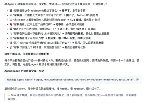 为了提高稳定性,还可以再配两个工具:multi-search-engine和Agent Reach。前者会调用多个搜索引擎作为兜底,后者可以搜索小红书、X、YouTube、Reddit、B站,非常适合做内容研究。