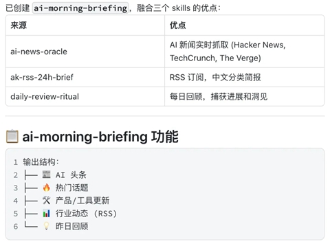 多skills融合当skills越来越多时,可以做一件很有意思的事情:融合skill。例如你安装了三个新闻相关的skill,可以让Agent分析它们的结构,然后合并优点,生成一个新的skill。这样你就得到一个完全定制的工具。