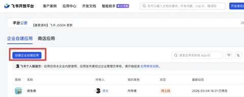 登录飞书开放平台:https://open.feishu.cn/app单击“创建企业自建应用”按钮。