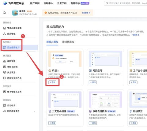 添加机器人能力。左侧导航栏选择“应用能力 > 添加应用能力”。选择“按能力添加”页签,单击“机器人”能力卡片的“添加”按钮。