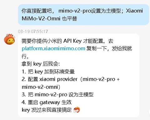 有了Key,你就能调用小米全家桶模型了。接下来将其接入“龙虾”。