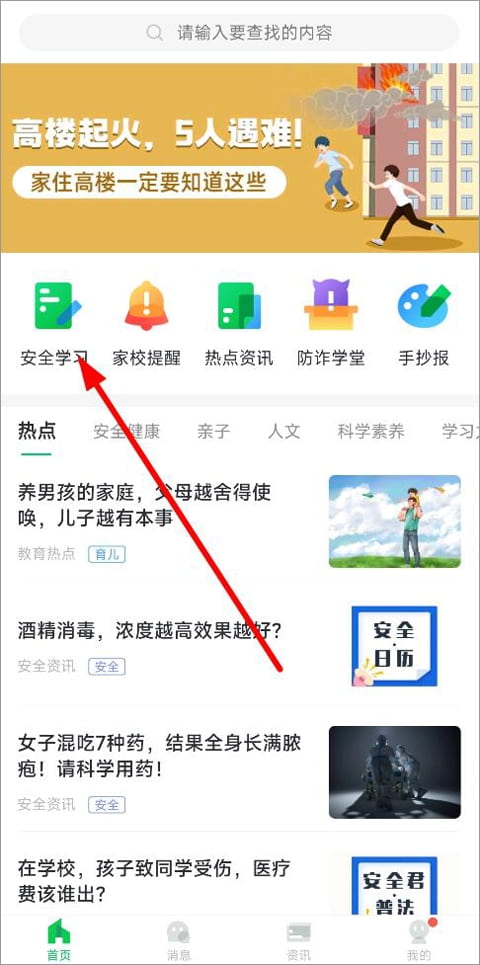 2、登录后进入首页,首页有安全学习、学校提醒、热点资讯、防炸学堂等栏目,点击安全学习打开微信小程序;