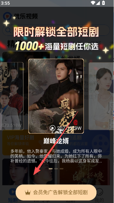2、点击标题菜单页的会员免广告解锁全部短剧选项,继续进行下一步的操作。