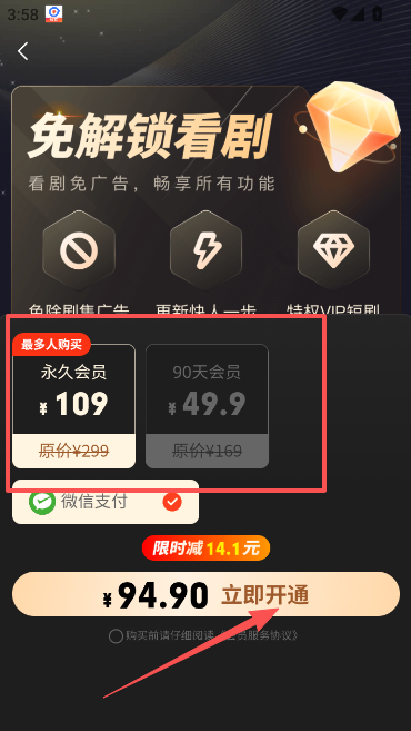 5、下单支付购买会员权限服务,解锁更多短剧视频资源播放。