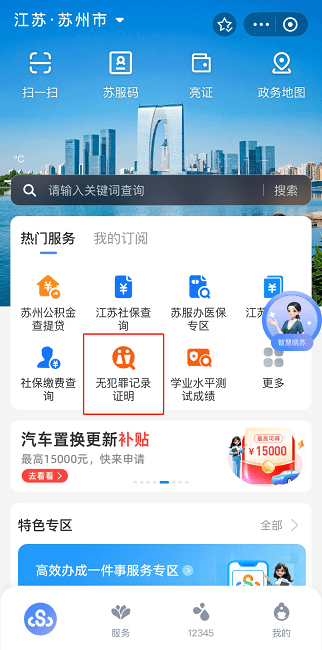 登录苏服办app之后,在首页搜索“无犯罪记录证明”进入服务;