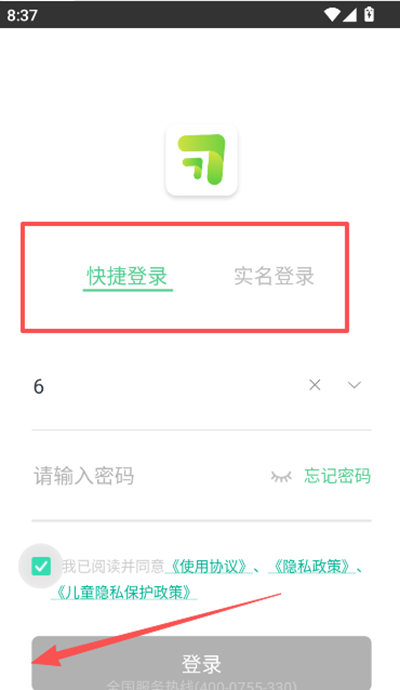 若因重名原因无法登陆,可点击“快捷登陆”,输入账号密码进行登陆。