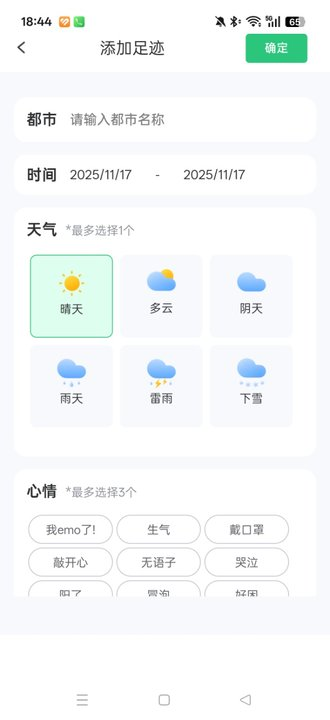 2、添加都市足迹,需要编辑都市名称、天气以及心情等添加,还可以编辑所要记录的内容部分。