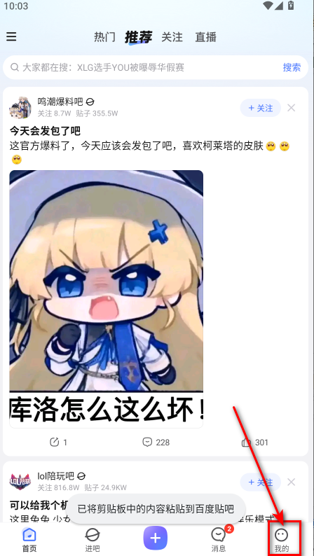 打开百度贴吧APP,进入首页界面后点击右下角的【我的】。