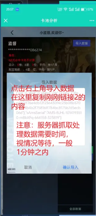 4、注册并登录软件,在抽卡分析界面右上角点击导入,粘贴刚刚复制的数据