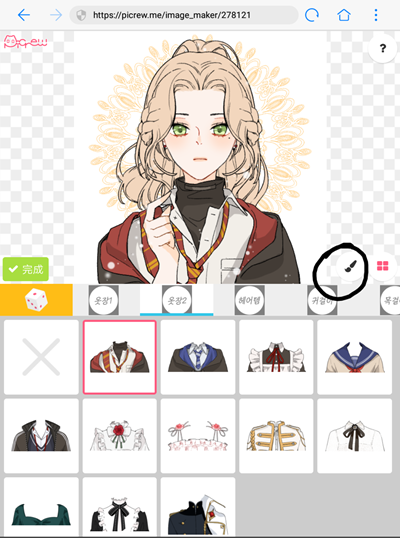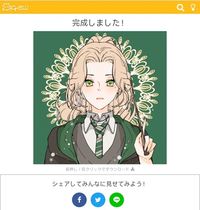 5、首先选定衣物,再点击画笔按钮(图中黑框),在页面中选择颜色,就能改款(特别说明:有些衣服只能改变颜色,具体看模板),蛇院需通过狮院改色,獾院需通过鹰院改色。进行到最后,点击绿色完成按钮,长按图片保存到相册,完成。