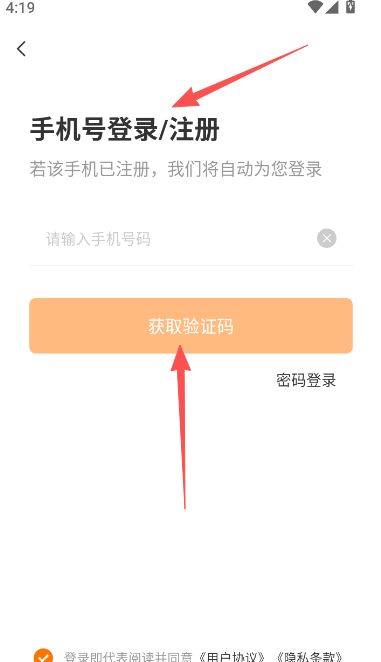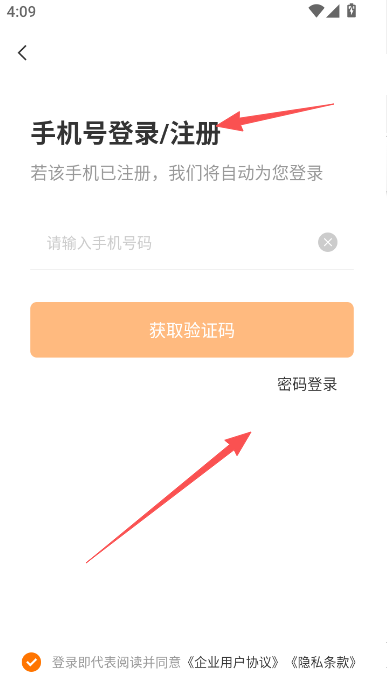 3、输入手机号码注册,若此前使用过直接用密码登录。