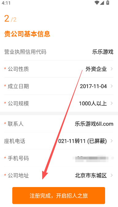 5、输入所在公司基本信息,完整补全各项内容,完成以后点击注册完成,并开始招人之旅。
