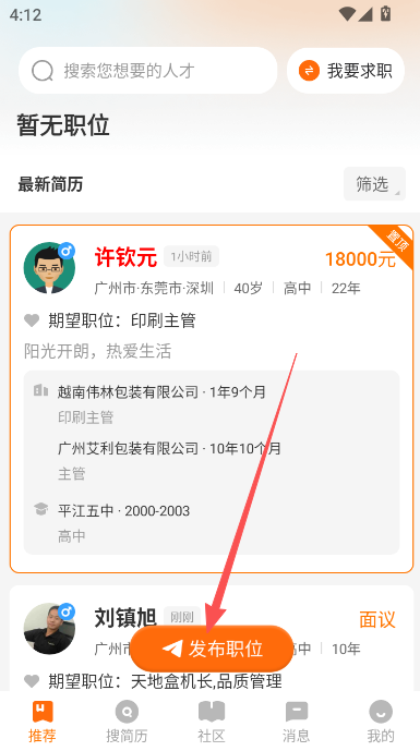 2、发布简历提示请选择招聘方。