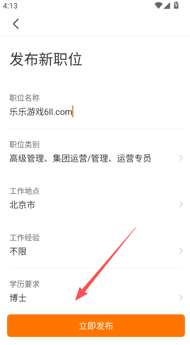 7、输入职位名称、职位类别、工作地点、工作经验以及学历要求,点立即发布。
