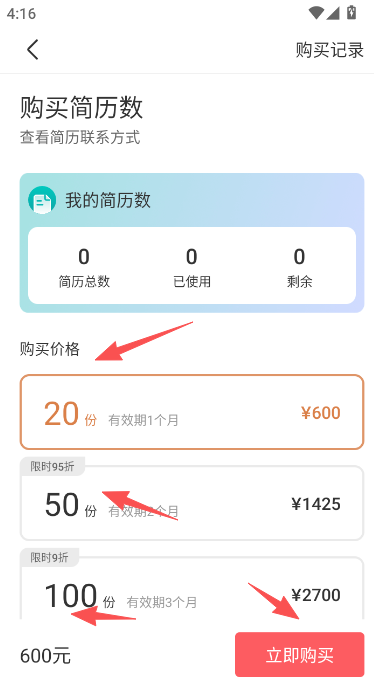 2、按实际需求选择下购买,每个档位的简历数量以及购买金额都是不同的。