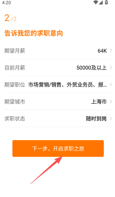 3、完整个人资料信息,求职意向,点击开启求职之旅。