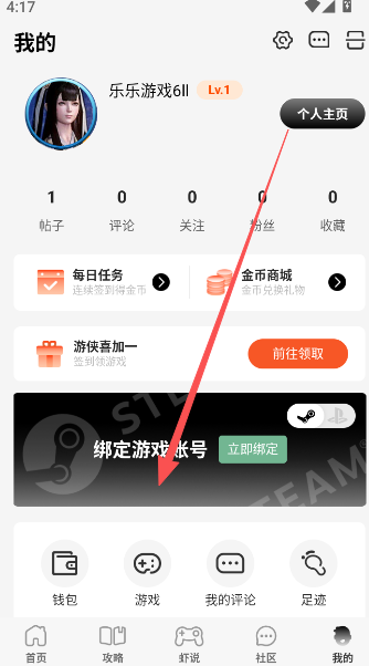 1、登录用户账号以后,在我的页面中点击选择绑定steam游戏账号。