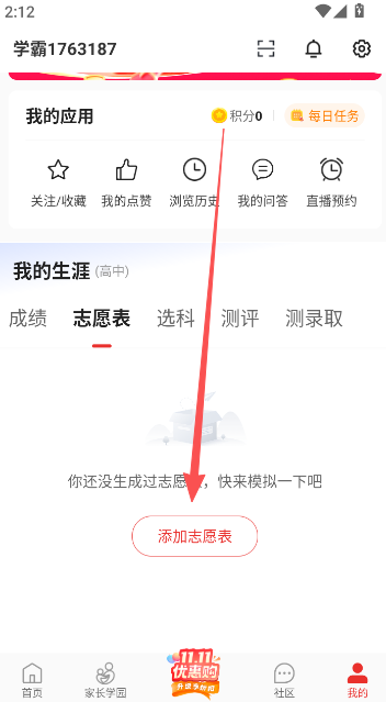 4、在我的界面找到志愿表功能选项,点击添加志愿表。