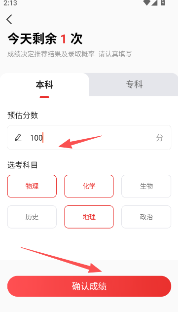 5、选择录取批次并,预估分数,点击要选考的科目点击,完成后选择确认成绩。