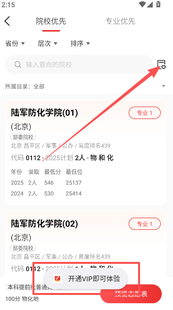 7、预览操作后确定符合你的报考需求,可点击上方的志愿表导出功能选项,该项功能为VIP付费需要支付费用后进行导出操作的。