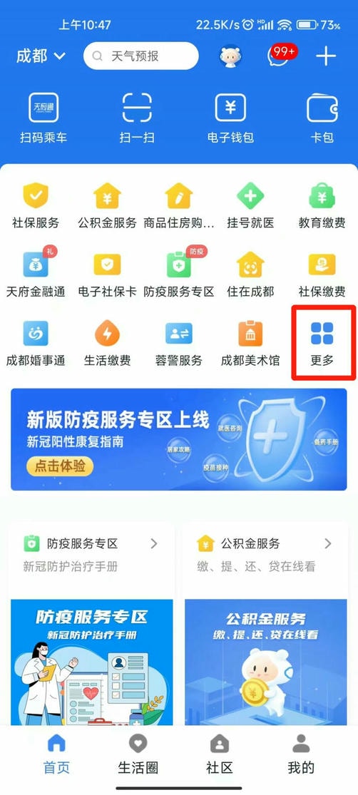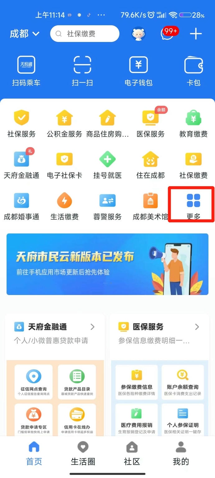 ·在乐乐游戏下载打开成都天府市民云app,进入首页,找到【更多】;