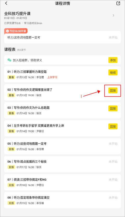 2、进到界面后,在课程表下方可以看到相应的课程右侧有“回放”点击就能够进行回放啦。