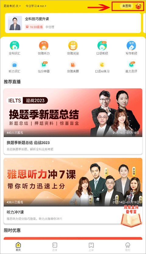 方式二电脑网页端听课:进入【土豆雅思】官网网址:https://www.todoen.com/,输入报名讲座时用的【手机号+验证码】登录。点击【学习中心】-【公开课/特训班】,即可找到直播入口。(强烈建议使用APP听课,听课体验最佳并可以和老师互动、参与直播间抽奖活动等~)温馨提示:如果已经报名课程但通过以上二种方式找不到课程,说明账号登陆错误!请用报名课程时使用的〔手机号+验证码〕登录!