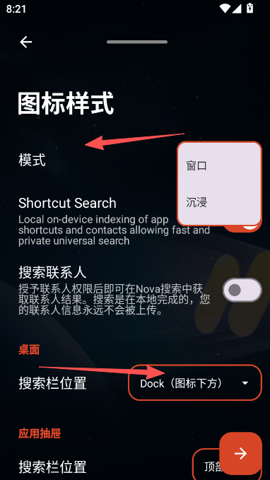 2、在图标样式栏中对主题图标的模式、搜索栏位置以及应用抽屉位置进行布局设置。