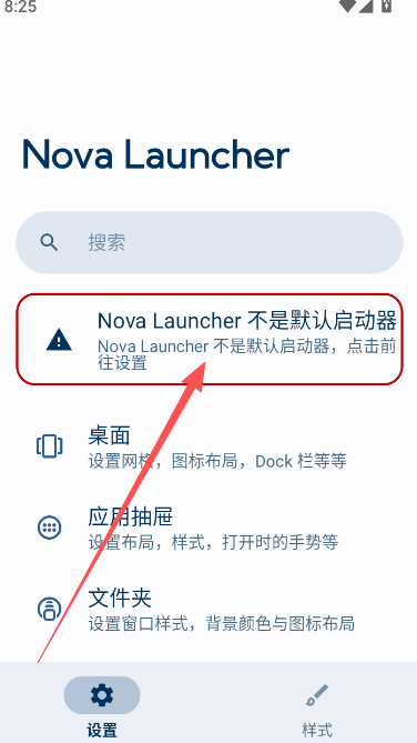 1、进入Nova启动器工具的设置界面,点击置顶提示框内的选项前往设置。