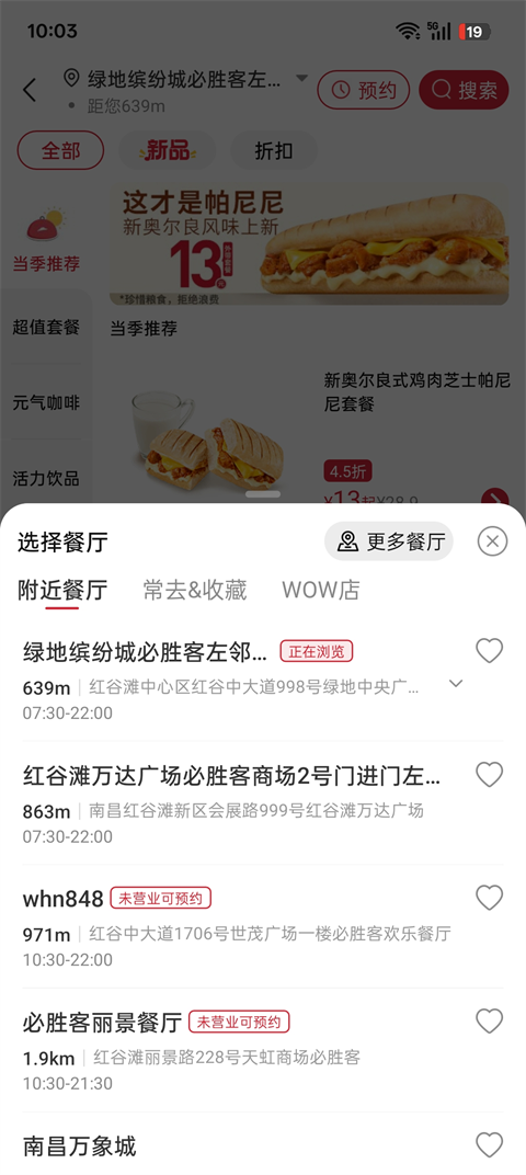 2、然后开始点餐,软件会定位到用户附近的必胜客餐厅,如果想要切换餐厅,点击餐厅