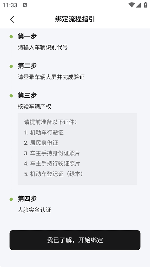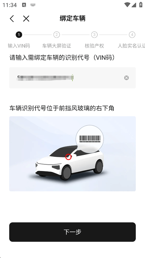 3、输入需绑定车辆的识别代号(VIN码)后点击下一步,继续车辆大屏验证、核验产权以及人脸实名认证,直到绑定成功。