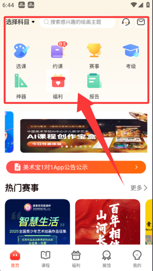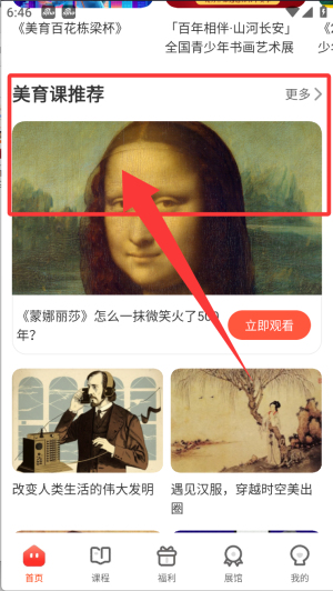 3、往下划找到美育拓展馆,根据学员自身情况选择对应级别,选择级别之后直接在当前级别课程列表页进行兑换;