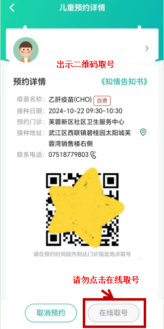 在取号机向医生出示“取号二维码”(请勿点击在线取号,在线取号视无效)