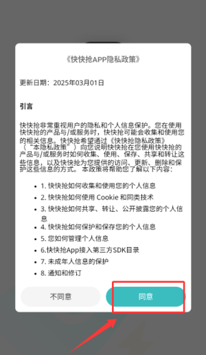 1、在快快抢APP中点击"同意"隐私政策,进入程序界面。