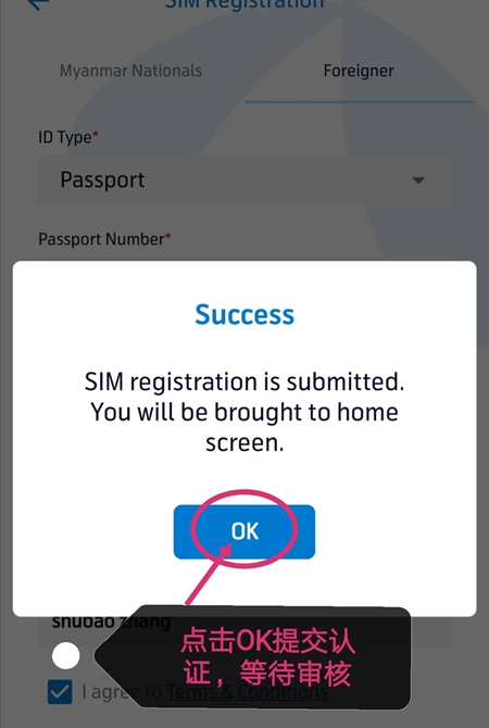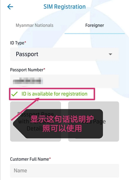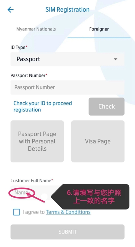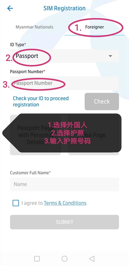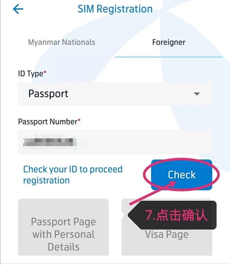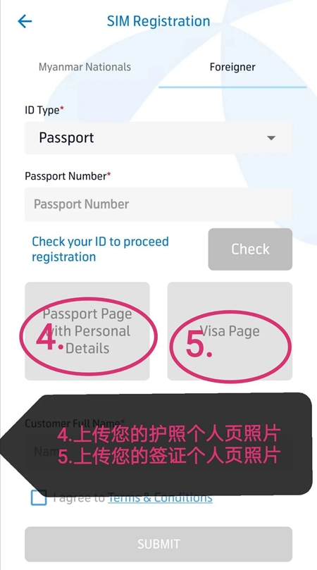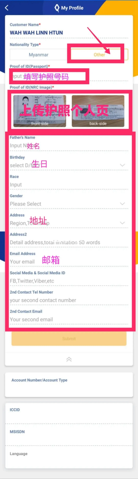 ③如果您不是缅甸人,就需要准备好您的护照(护照需要在有效期内)个人页拍照上传上去,然后填写基本信息提交即可。