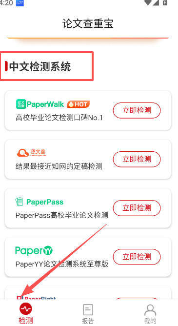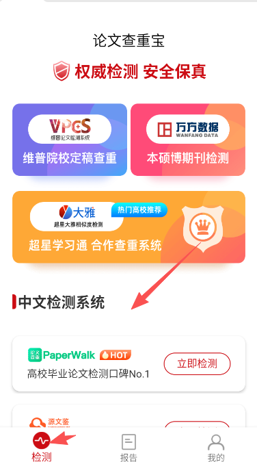 1、在论文查重宝检测栏目,添加你需要检测查重的论文,选择中文检测系统下的查重方式立即检测。