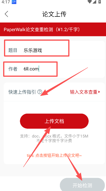 4、输入沦为标题、作者查看文档的快速上传指引,开始检测。
