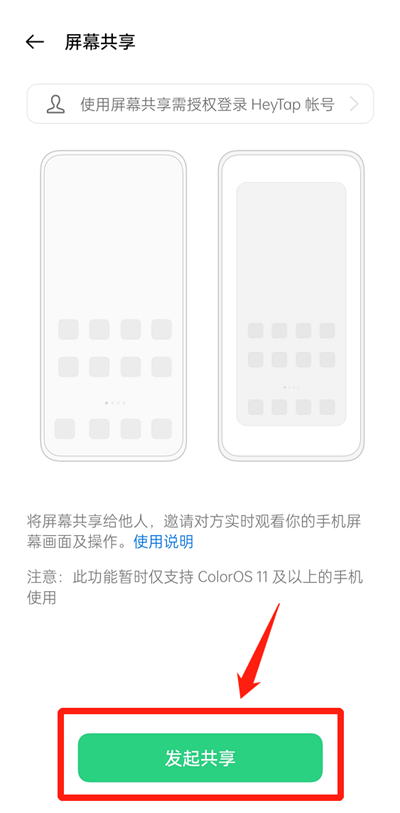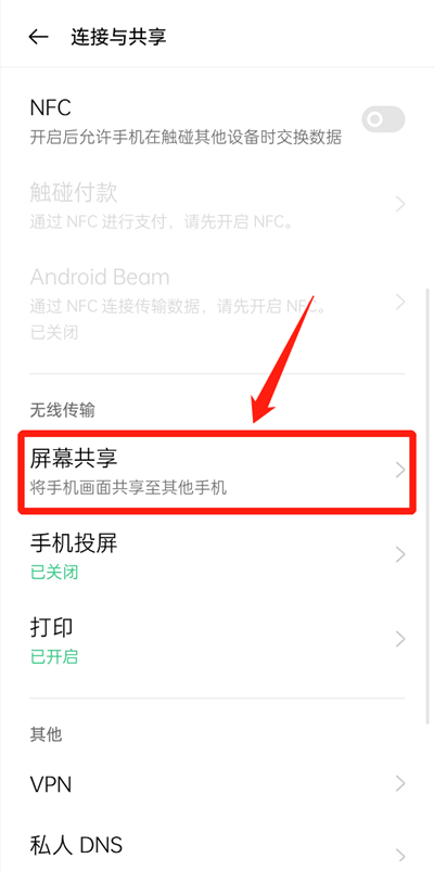 操作路径:进入【设置】- 点击【连接与共享】- 点击【屏幕共享】- 成功绑定对方的OPPO账号,即可开启屏幕共享。