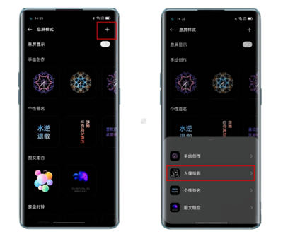 第三步在“息屏样式”的设置界面点击右上角“+”,就会出现“人像绘影”的选项
